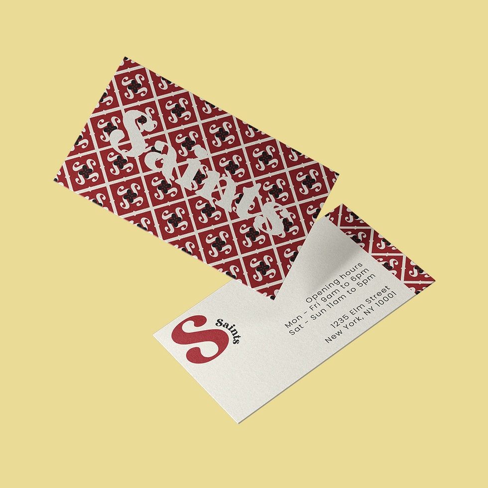 Saints sells wallpaper with Victorian prints. For this brand, I designed a logo, a visual and a pattern. With these, I designed a business card and packaging.